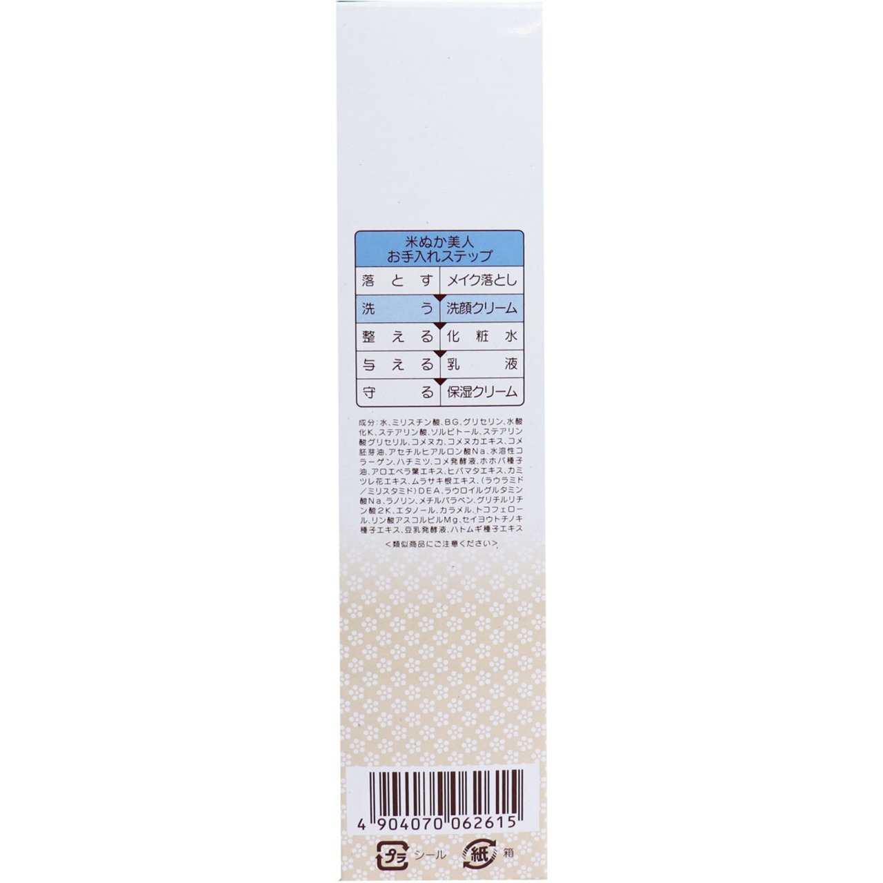 水、ミリスチン酸、BG、グリセリン、水酸化K、ステアリン酸、ソルビトール、ステアリン酸グリセリル、コメヌカ、コメヌカエキス、コメ胚芽油、アセチルヒアルロン酸Na、水溶性コラーゲン、ハチミツ、コメ発酵液、ホホバ種子油、アロエベラ葉エキス、ヒバマタエキス、カミツレ花エキス、ムラサキ根エキス、(ラウラミド/ミリスタミド)DEA、ラウロイルグルタミン酸Na、ラノリン、メチルパラベン、グリチルリチン酸2K、エタノール、カラメル、トコフェロール、リン酸アスコルビルMg、セイヨウトチノキ種子エキス、豆乳発酵液、ハトムギ種子エキス