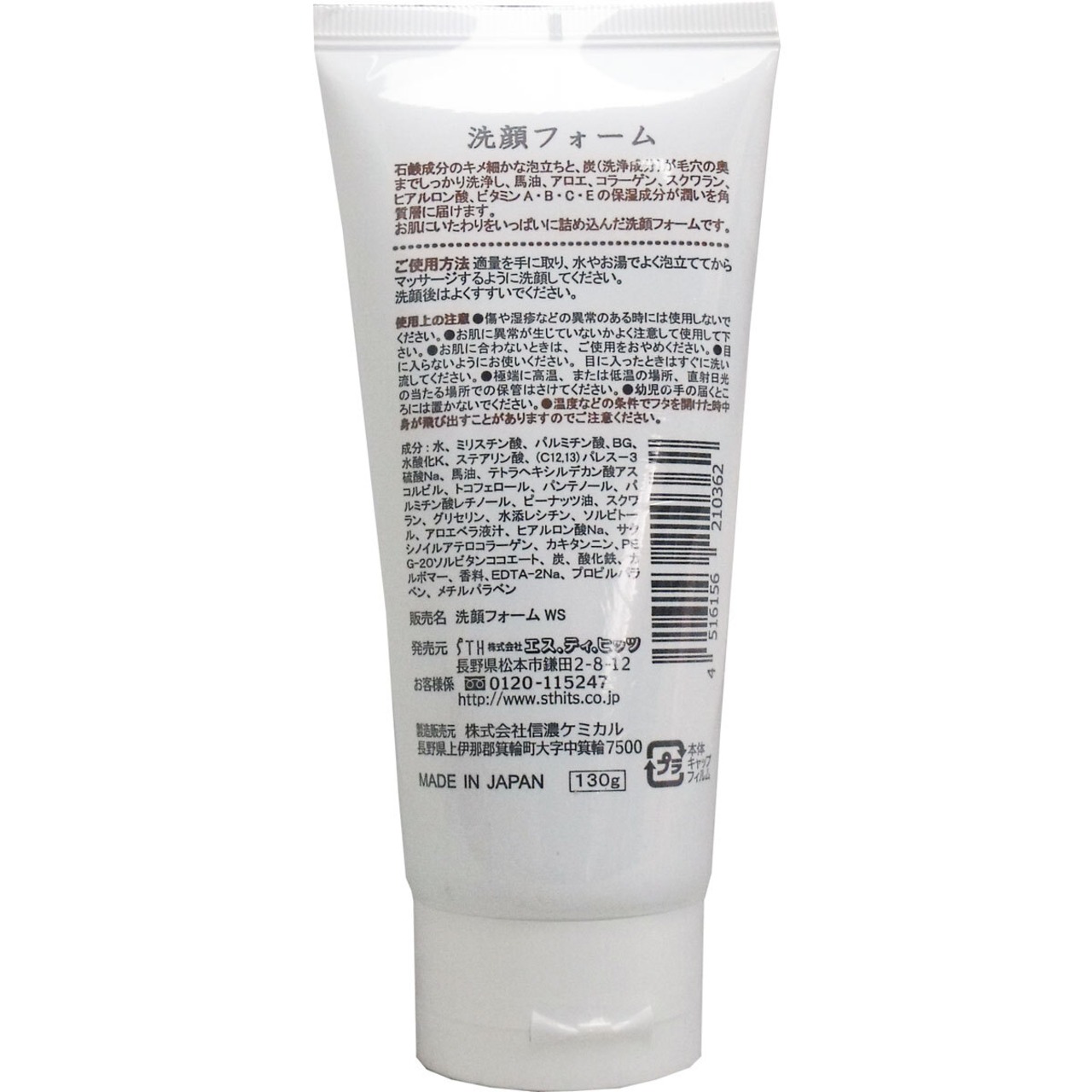 水、ミリスチン酸、パルミチン酸、BG、水酸化K、ステアリン酸、(C12.13)パレス-3硫酸Na、馬油、テトラヘキシルデカン酸アスコルビル、トコフェロール、パンテノール、パルミチン酸レチノール、ピーナッツ油、スクワラン、グリセリン、水添レシチン、ソルビトール、アロエベラ液汁、ヒアルロン酸Na、サクシノイルアテロコラーゲン、カキタンニン、PEG-20ソルビタンココエート、炭、酸化鉄、カルボマー、香料、EDTA-2Na、プロピルパラベン、メチルパラベン
